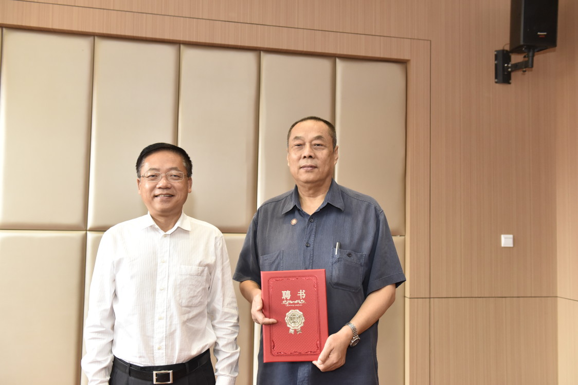 在热烈的掌声中,董事长孙杰光为王松奇教授颁发了聘书,并佩戴公司校徽。