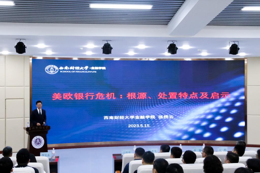 张桥云教授聚焦3月份以来的美欧银行危机这一热点事件,以硅谷银行、签名银行、第一共和银行以及瑞士信贷集团为例,系统回顾梳理了美欧银行危机事件的发展进程,深入剖析了危机产生的根源和处置特点,深刻阐述了此次美欧银行危机对中国的影响与启示。报告会采取师生互动的形式,深入浅出地对热点时事进行理论解读,为全体参会师生上了生动一课。