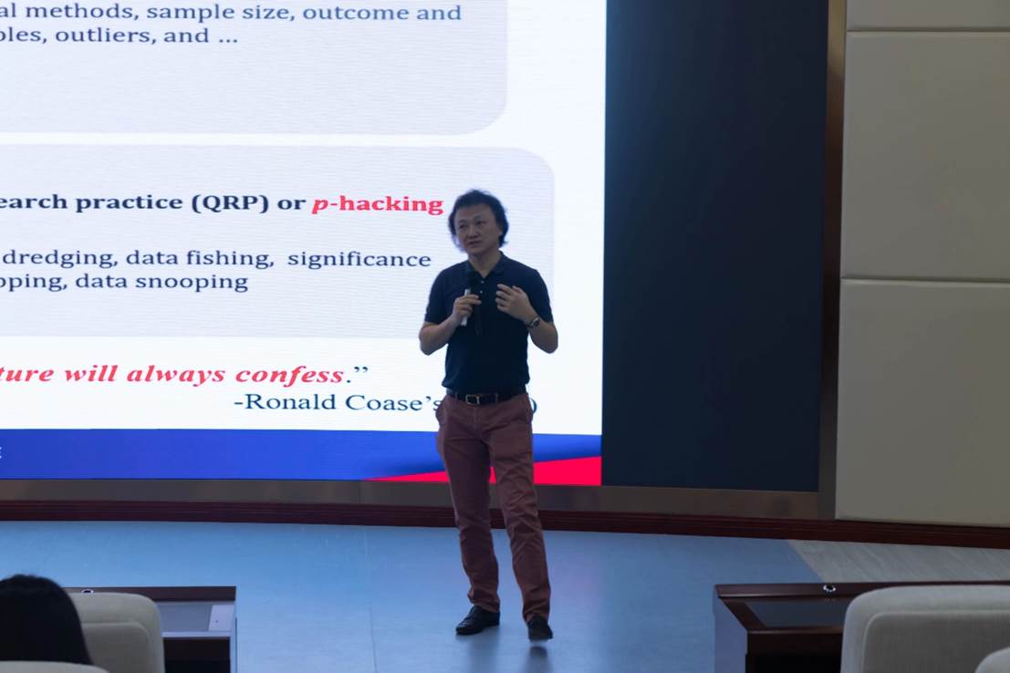 会上,常鑫教授充分论证了当前科研生态下,实验研究与实证研究结果中存在P值不连续,即P值操纵的可能性,并具体探讨了造成这一问题的驱动因素以及如何运用计量方法分析P值操纵的影响因素。常鑫教授不仅为公司师生展示了规范的科研论文的写作框架和研究范式,同时也提升了师生们的学术规范理念,加强了公司科研诚信和学术道德建设。
