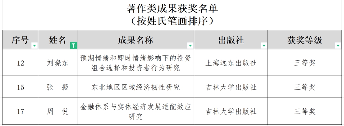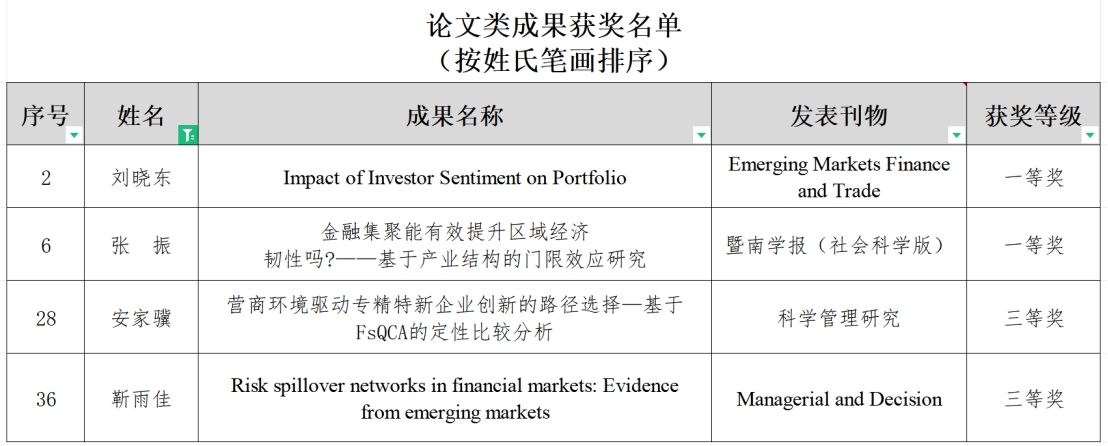 刘晓东、张振同时获论文类成果一等奖和著作类成果三等奖;安家骥、靳雨佳获论文类成果三等奖;周悦获著作类成果三等奖。